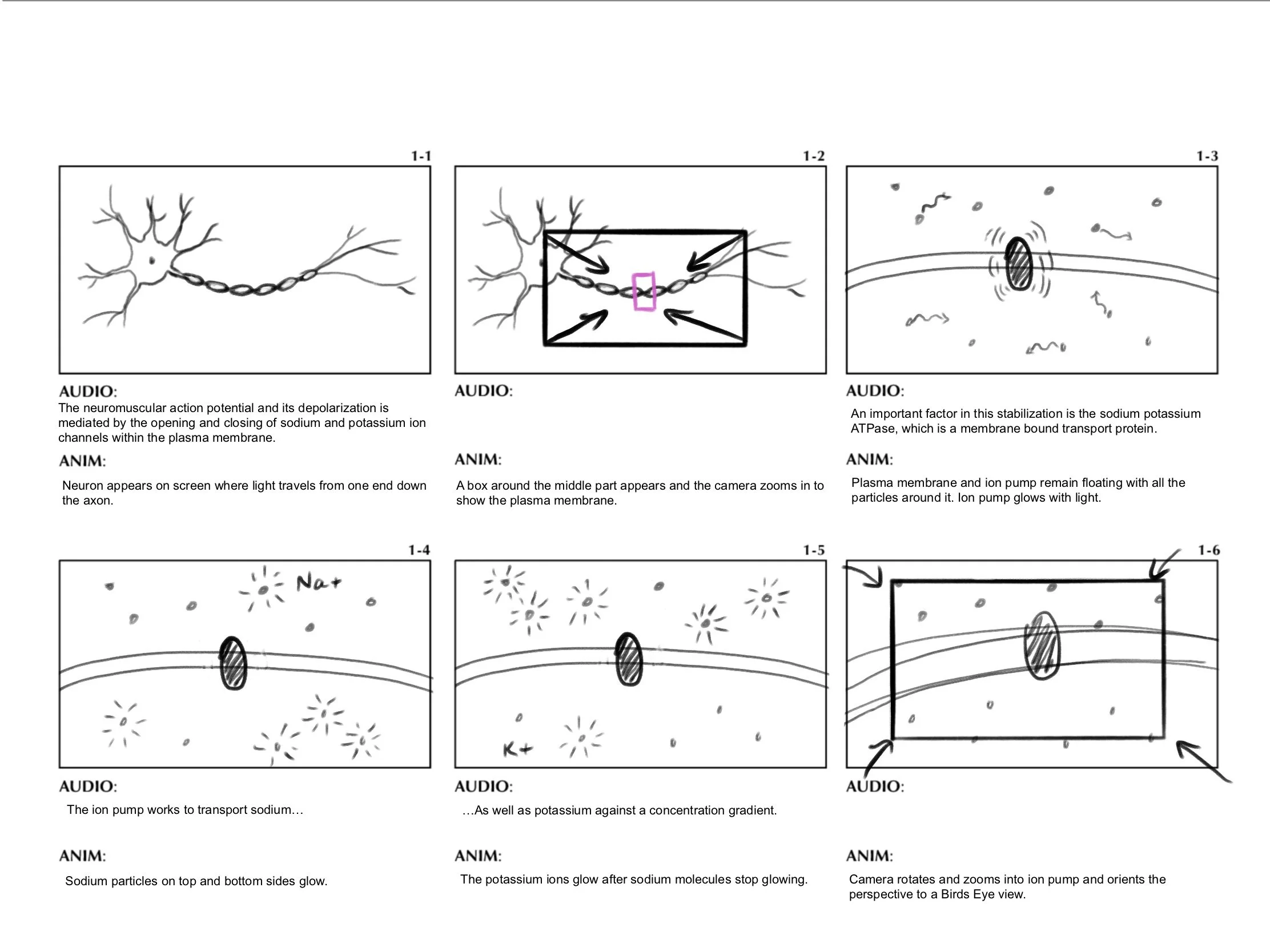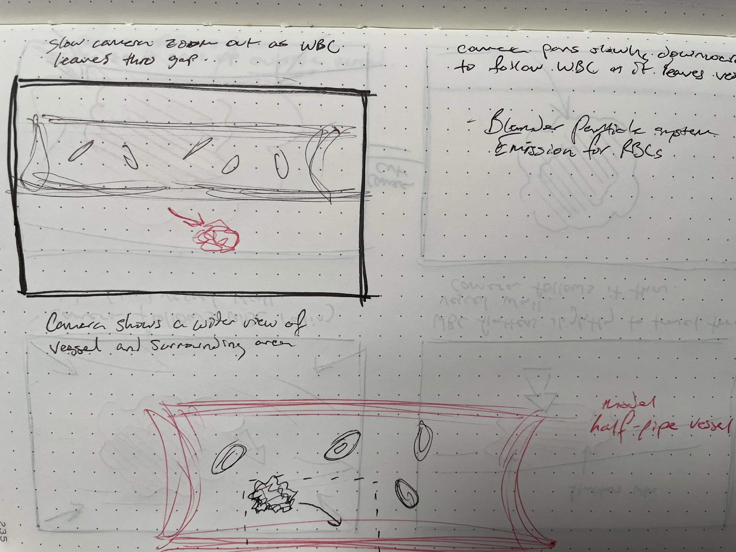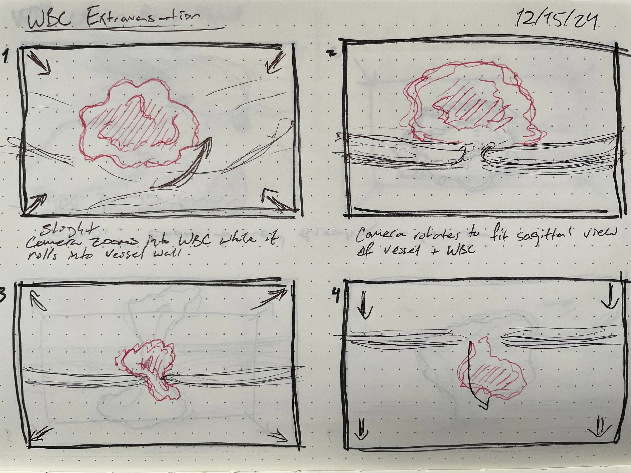 This is a storyboard to show a short 5 second clip of white blood cell extravasation. The cell is shown in red ink along with camera movements that follow its exit from the vessel.