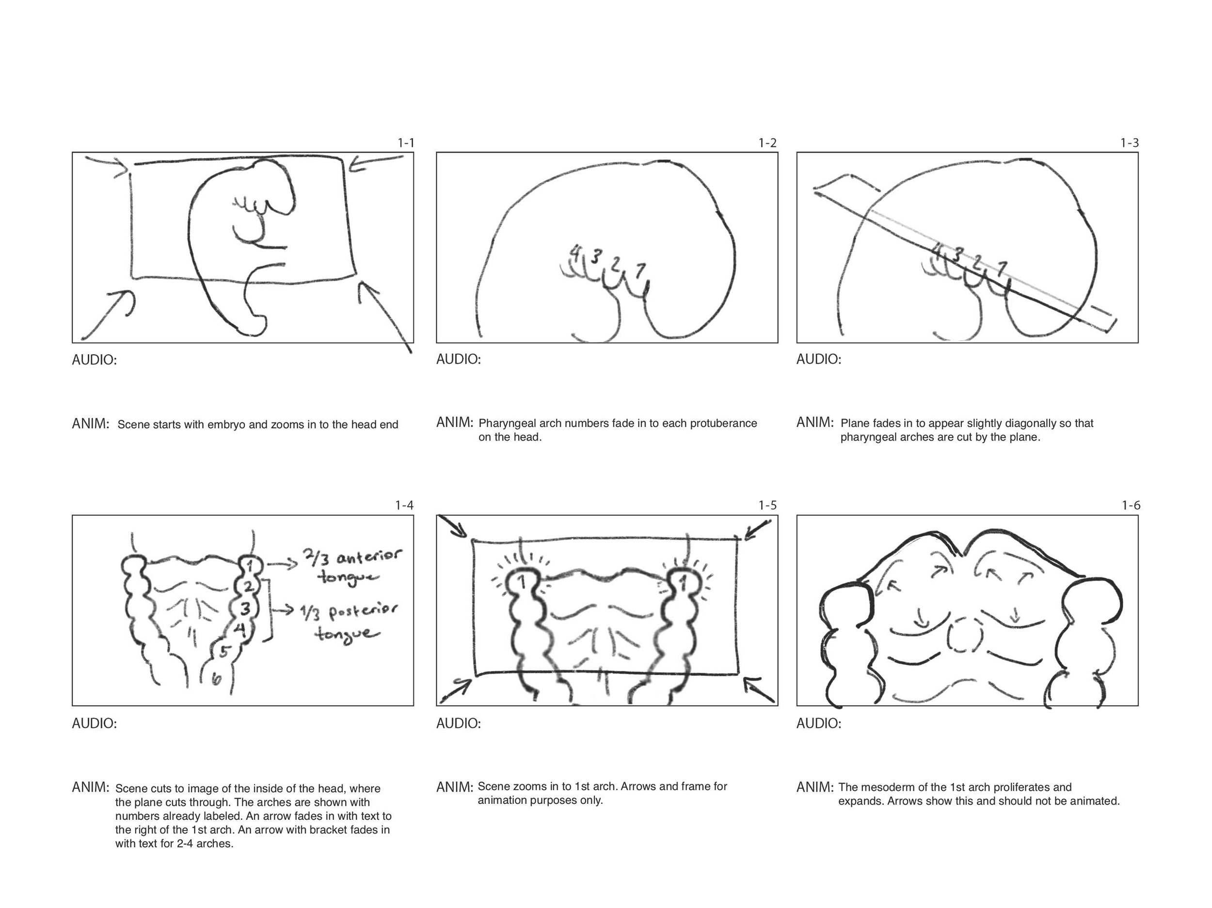 This is a storyboard for an interactive application that teaches embryology to medical and biology students. The scene shows typical human tongue development with the purpose of comparison to ankyloglossia.
