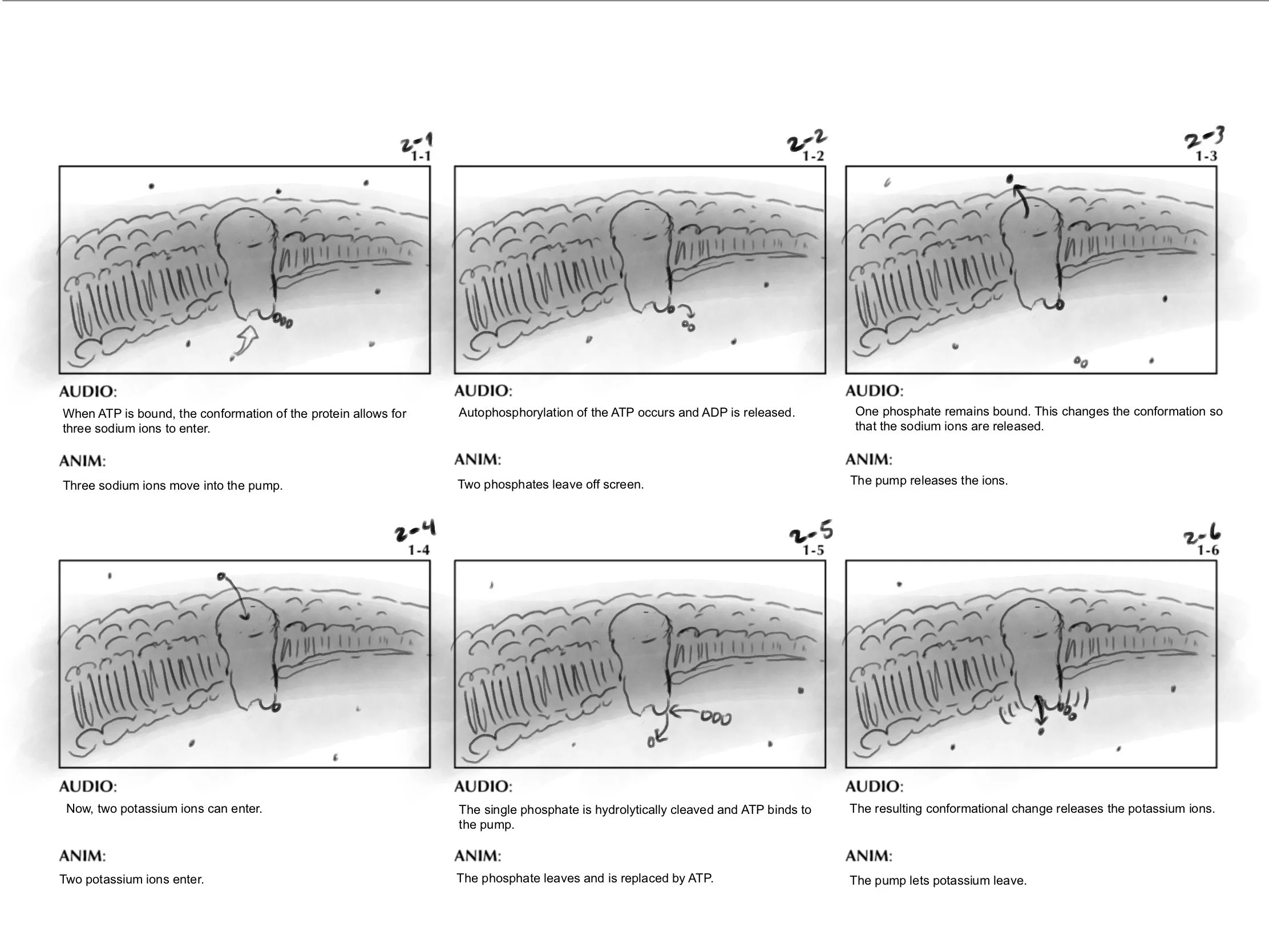 The biochemical processes of a sodium-potassium ion channel in a lipid bilayer are shown in a minute-long scene.