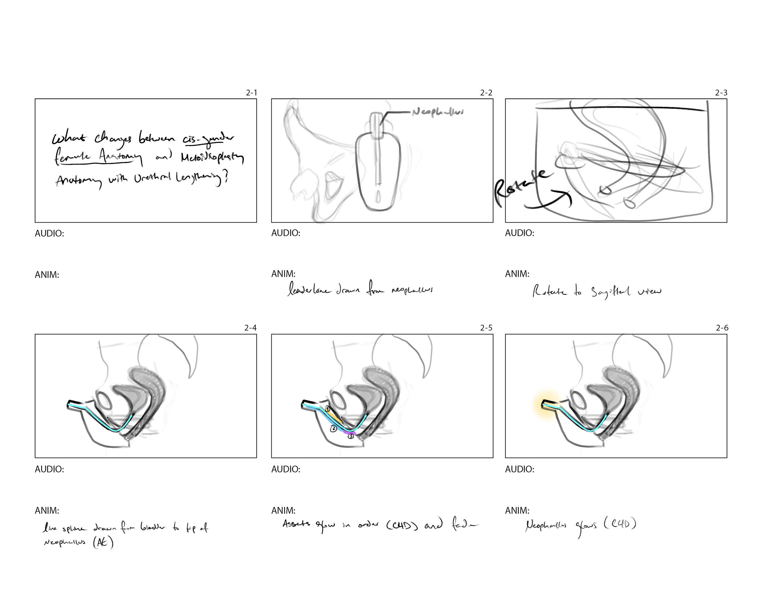 This is a storyboard that guides nursing and practitioners through metoidioplasty anatomy with urethral lengthening. This final version informed my research project, which was to create a video that teaches the surgically altered anatomy.
